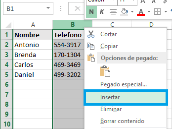 - Mantenga pulsada la tecla CTRL, haga clic en las filas seleccionadas y luego, en el menú emergente, haga clic en Insertar.